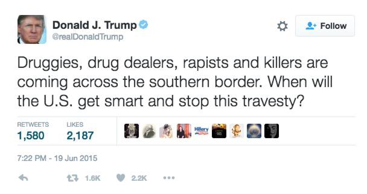 A tweet, which is one of many, in which President Trump appears to demonise Mexican immigrants